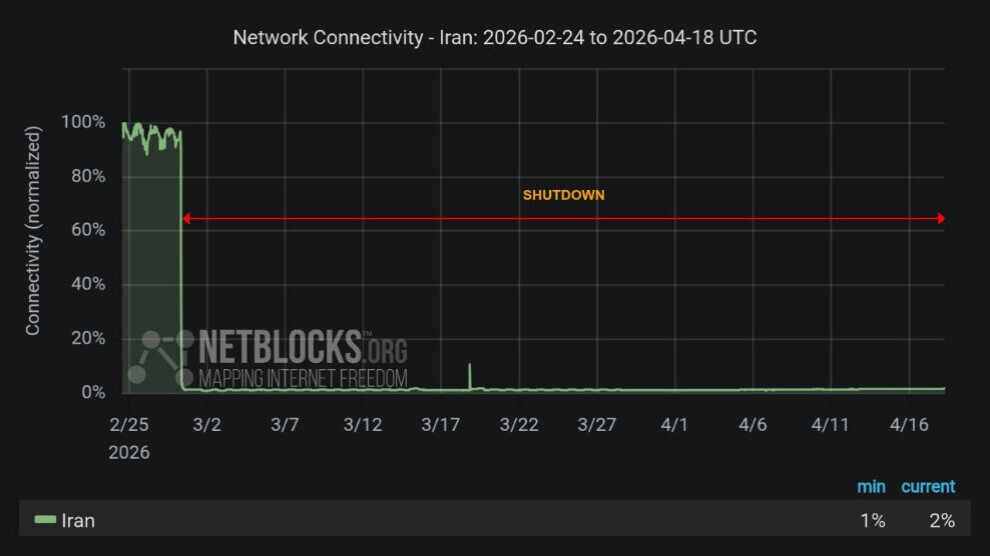 أعلنت منظمة " "Netblocksالمعنية بمراقبة الوصول إلى الإنترنت، اليوم السبت 19 أبريل/نيسان، أن انقطاع الإنترنت في إيران استمر لأكثر من 1170 ساعة، ما يجعلها واحدة من أطول حالات انقطاع الإنترنت على مستوى البلاد.