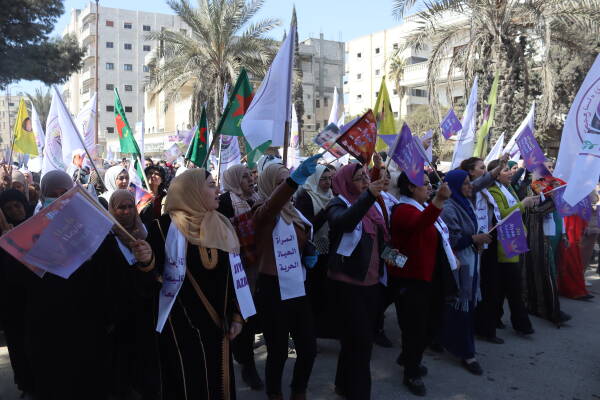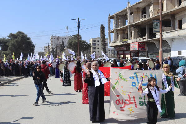 ضمن سلسلة فعاليات الثامن من آذار/مارس، خرجت المئات من نساء مقاطعتي الرقة ودير الزور في مسيرات حاشدة، أما نساء مدينة كوباني بدأن فعالياتهن بتزيّن ساحة المرأة الحرة.