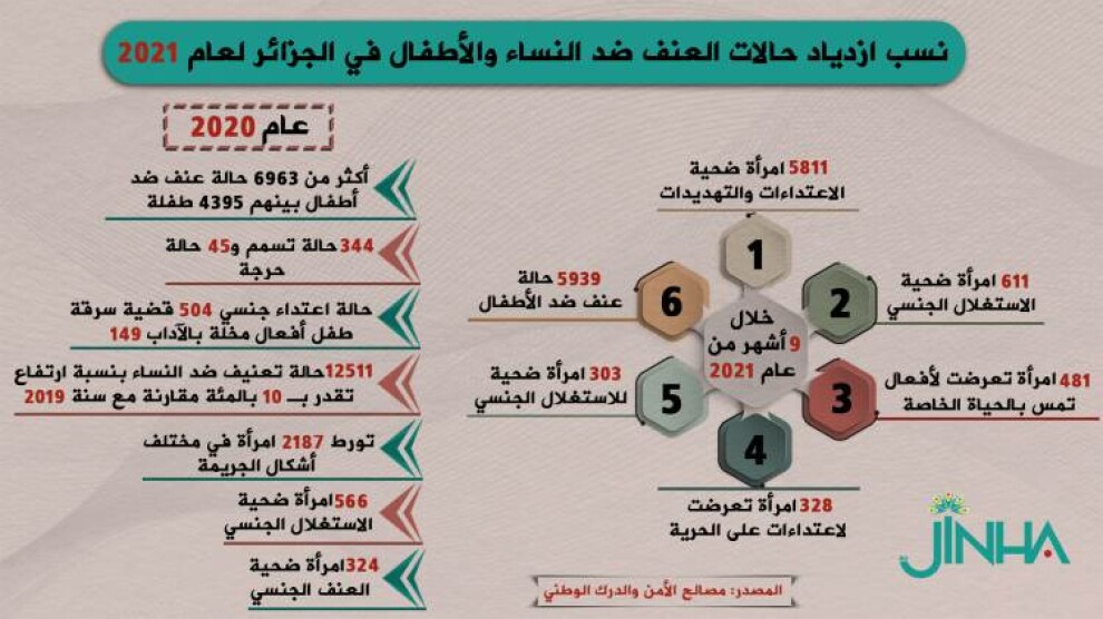 أما خلال العشرة أشهر الأولى من سنة 2021، فقد سجلت مصالح الدرك الوطني تعرض 12331 امرأة لمختلف أشكال العنف، بينهن 5811 امرأة تعرضن للاعتداءات والتهديدات، فيما تعرضت 611 امرأة للاستغلال الجنسي.