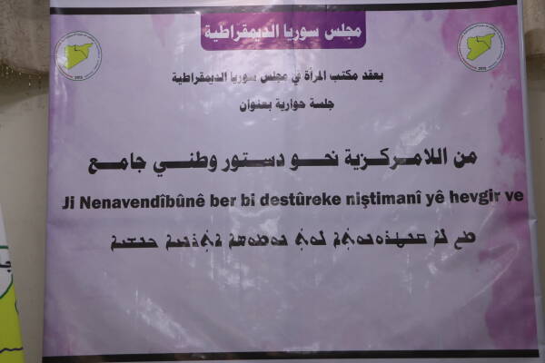نظم مكتب المرأة في مجلس سوريا الديمقراطية اليوم السبت الثامن من تشرين الثاني/ نوفمبر، جلسةً حوارية بعنوان "من اللامركزية نحو دستور وطني جامع" بمشاركة نخبة من المُثقفات، ونساء من الأحزاب السياسية، والمؤسسات المدنية وشخصيات مُستقلة، نُقشن من خلالها العديد من الأفكار التي تشغل الرأي العام السوري في الوقت الحالي، وعلى وجه الخصوص فكرة تطبيق نظام الحكم اللامركزي في سوريا، وكتابة دستور وطني يحمي حقوق النساء وكافة المكونات السورية.