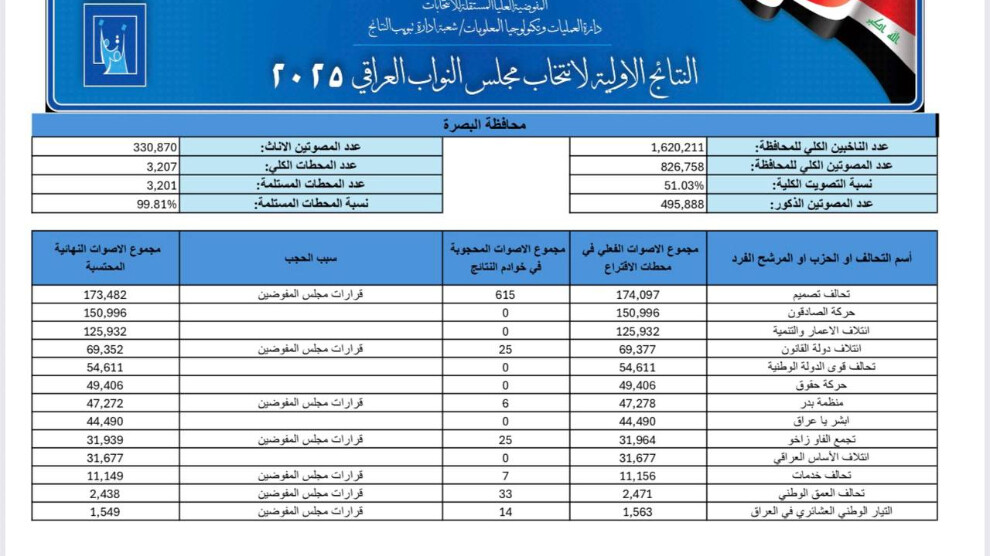 أعلنت المفوضية العليا للانتخابات في العراق النتائج الأولية لانتخابات الدورة السادسة للبرلمان.