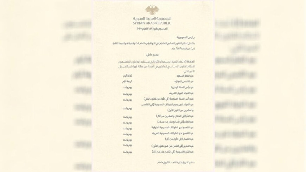 وقد أقصى المرسوم ذات الرقم (188) لعام 2025، عيد نوروز والذي يصادف 21 أذار/مارس والذي يعتبر عيداً قومياً تحتفل بها الشعوب الآرية ويحتفل به الشعب الكردي في كافة أجزاء كردستان والعالم، ووفقاً لليونسكو، يحتفل ما يقرب من 300 مليون شخص حول العالم بعيد نوروز، ويرجع تاريخ عيد نوروز إلى عام 612 قبل الميلاد.