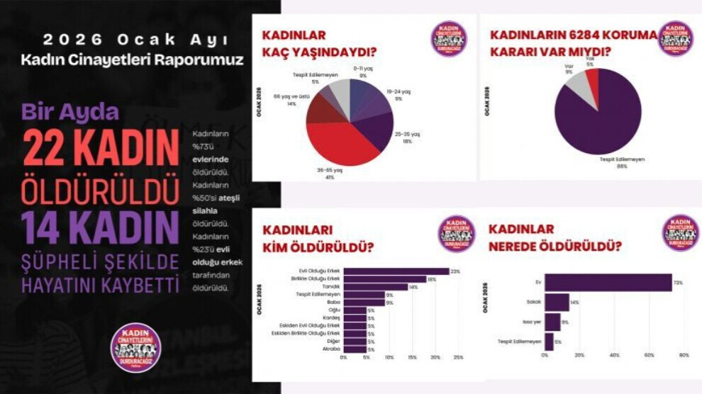 مركز الأخبار ـ أصدرت منصة "سنوقف قتل النساء" (KCDP) تقريرها الشهري لشهر كانون الثاني/يناير 2026، والذي أظهر مقتل 22 امرأة على يد رجال في أنحاء مختلفة من تركيا، فيما عُثر على جثث 14 منهن في ظروف وصفت بالغامضة.