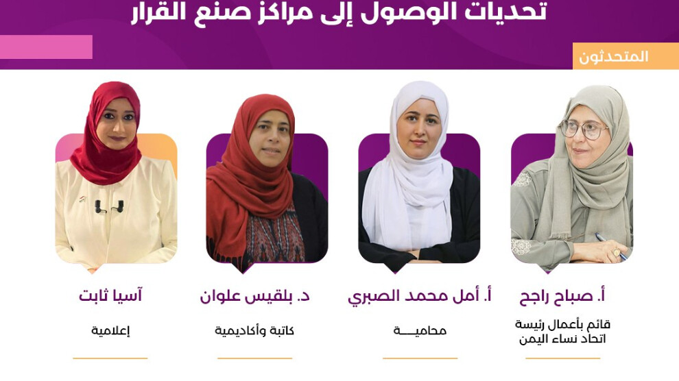 عقدت منصة "نسوان" ندوة افتراضية تحت عنوان "المرأة اليمنية.. تحديات الوصول إلى مراكز صنع القرار" لمناقشة أهم التحديات التي تواجهها المرأة اليمنية في مواقع صنع القرار وسبل حلها.