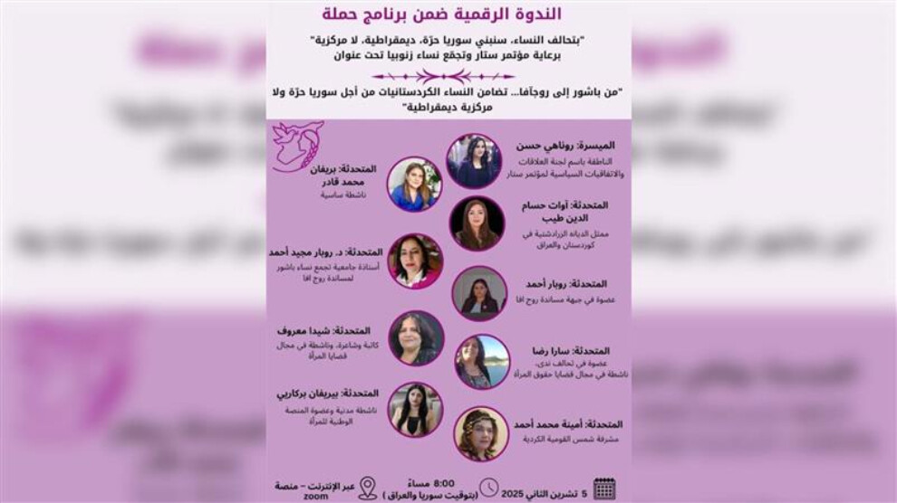 وشاركت في الندوة التي عقدت مساء اليوم الخامس من تشرين الثاني/نوفمبر 9 ناشطات في مجال قضايا المرأة ودبلوماسيات وسياسيات من شمال وشرق سوريا ومن إقليم كردستان.