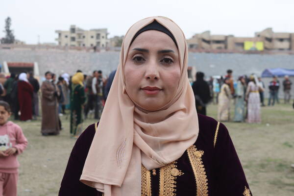 من جهتها لفتت إلى أجواء الاحتفال الرئاسة المشتركة لمجلس الشعوب العام فهيمة الجاسم "في كل عام تستعد نساء مقاطعة الرقة لاستقبال يومهن العالمي بكل حب وحماس كونه يعبر عن إنجازات ثورة المرأة، ونتاج ثمرة نضالهن، وقد تلون الملعب بالألوان الربيعة المشرقة فالنساء يرتدن الزي الفلكلوري الذي يعبر عن هويتهن وخليط ومزيج مكونات ثورة المرأة".