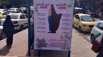 ملصقات تُعيد الوصاية على أجساد النساء في مدينة حماة السورية، تحت مسمى "اللباس الشرعي" والذي كان يفرضه داعش قسراً على النساء أثناء سيطرته على مناطق واسعة من سوريا والعراق.