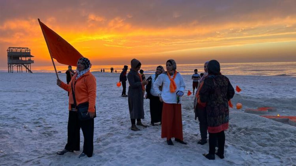 مع غروب الشمس كتبت النساء على شاطئ قطاع غزة "وجدنا لحمايتك" للتأكيد على رفض العنف أياً كان نوعه ومبرراته، وأضئن القوارب الصغيرة بعرض البحر باللون البرتقالي، ليندمج لونها مع الغروب.