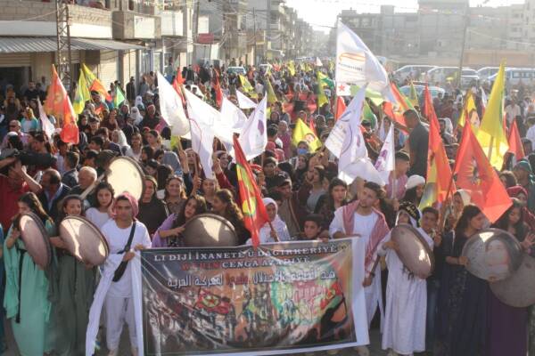 Hasakah- The Cizre Region Culture and Art Movement and the Cizre Region Revolutionary Youth Movement held a march in the Mifti district of Hasakah with the participation of hundreds of people to protest the ongoing Turkish attacks on their region. The people marching from the Kevok Square to the Culture and Art Center held a demonstration there.