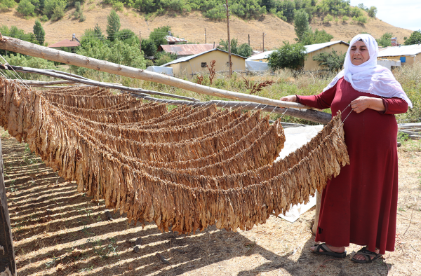 Women farmers, who have been hanging the leaves of tobacco up on a string to dry them in the sun after planting and harvesting tobacco, say they keep only food on the table after working for months. Saliha Güneş is one of these women. When her village was burned down in the 1990s, her family moved to the Lice district of Amed (Diyarbakır). Every year, she goes to Çewlîg from Amed with her family members because they rent land to plant tobacco in Çewlîg.