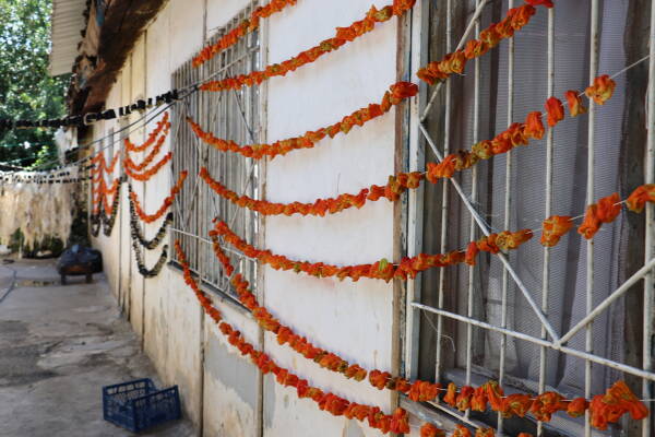 زنانی که تلاش میکنند فلفل و بادمجان خشک شده را در کیسهها به فروش برسانند، با صرف ساعات متمادی کار اضافی، قادر میشوند برای خانوادههای خود نان تهیه نمایند.
