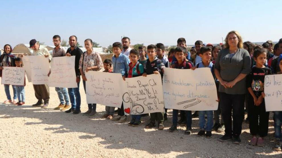 شهباء - معلمان کمیتهی آموزش اجتماعی عفرین به منظور محکوم کردن اقدامات و تغییرات دموگرافی در شهر عفرین توسط دولت اشغالگر ترکیه و مزدورانش و همچنین تغییر زبان منطقه و تحمیل آموزش زبان ترکی به مردم منطقه، بیانیهای صادر کرد. این اعلامیه در اردوگاه وَگَر در منطقهی شِراوا واقع در عفرین انجام شد. در این بیانیه دانشآموزان، معلمان و موسسات ولسوالی شِروا حضور داشتند و پلاکاردهایی با عنوان "نه به تغییر دموگرافی"، "ما دانشجو هستیم، قلمهای ما اشغالگران را تهدید میکند" در دست داشتند.
