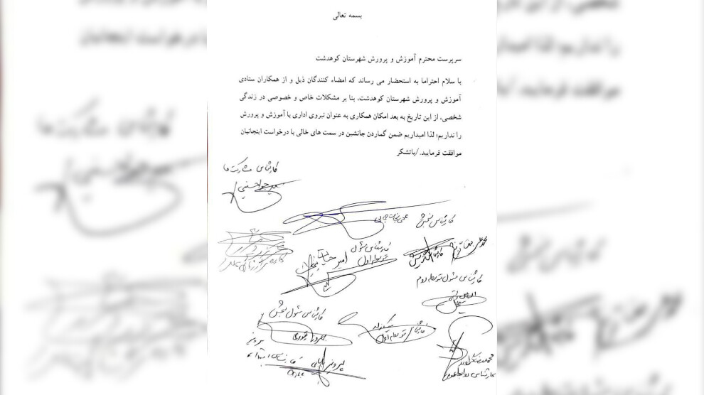 مرکز خبر- بە گزارش خبرگزاری زن، سەشنبە ۴ مرداد ١۴٠١، ١١ نفر از فرهنگیان با نوشتن نامەای دستەجمعی درخواست استعفای خود را بە ادارەی آموزش و پرورش کوهدشت ارائە دادند.