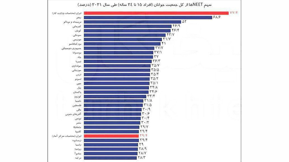 بهعبارتی نرخ ۷۷ درصدی NEETها ایران را در رتبه اول جهان و حتی بالاتر از کشورهای عمدتا آفریقایی قرار میدهد. گویان، سومالی، موریس، بورکینافاسو، جمهوری دومینیکن، بوتسوانا، چاد، لیبریا، مولداوی، موریتانی، اردن، لسوتو، بنین، نپال، پاکستان، کوزوو، نامیبیا، فلسطین، مالی، آفریقای جنوبی، تونس، مصر، جامائیکا و گامبیا کشورهایی هستند که در رتبههای ۳ تا ۲۸ قرار دارند، اما اگر نرخ ۲۹ درصدی مرکز آمار ایران و بانک جهانی مدنظر قرار گیرد، ایران به رتبهی ۲۸ جهان میرسد.