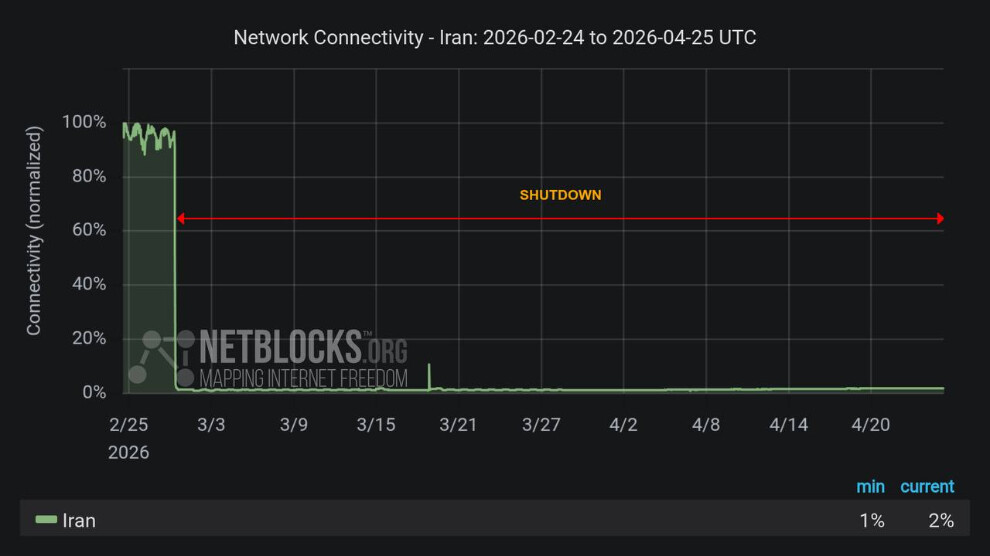 مرکز خبر- در حالی که پنجاهوهفت روز از آغاز محدودیتهای گسترده اینترنت در ایران میگذرد، امروز شنبه ۵ اردیبهشتماه، نتبلاکس گزارش داد سطح اتصال همچنان نزدیک به یک درصد است و این وضعیت ادامه دارد.