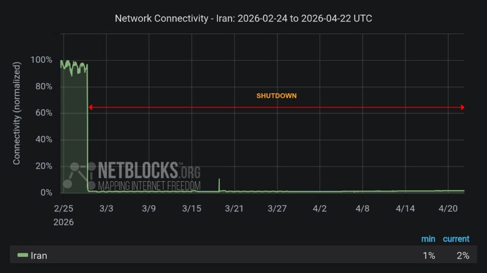 مرکز خبر- امروز چهارشنبه ٢ اردیبهشتماه، نتبلاکس، نهاد ناظر بر دسترسی به اینترنت در جهان، گزارش داد ایران وارد پنجاهوچهارمین روز قطع اینترنت بینالمللی شده است؛ وضعیتی که بهطور مداوم بیش از ۱۲۷۲ ساعت ادامه یافته و یکی از طولانیترین اختلالهای ثبتشده در سالهای اخیر به شمار میرود.