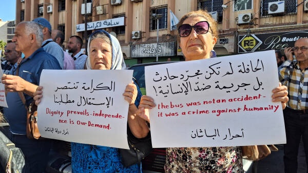 امروز شنبه اول نوامبر، در میدان «الکرامة» شهر سویداء، ده‌ها نفر از شهروندان تجمع اعتراضی برگزار کردند تا حمله علیه اتوبوس حامل غیرنظامیان را محکوم کنند. طی این حمله، دو نفر جان باختند و شماری نیز زخمی شدند که برخی از آنان در وضعیت بحرانی قرار دارند؛ موضوعی که خشم افکار عمومی را برانگیخته و شهروندان خواستار تأمین امنیت جاده‌ها و مجازات مسئولین حادثه هستند.