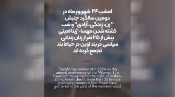 زنان زندانی در بند زنان زندان اوین، امشب در دومین سالگرد قتل حکومتی ژینا امینی، در حیاط بند تجمع کرده و سرود «ژن ژیان ئازادی» سر دادند.