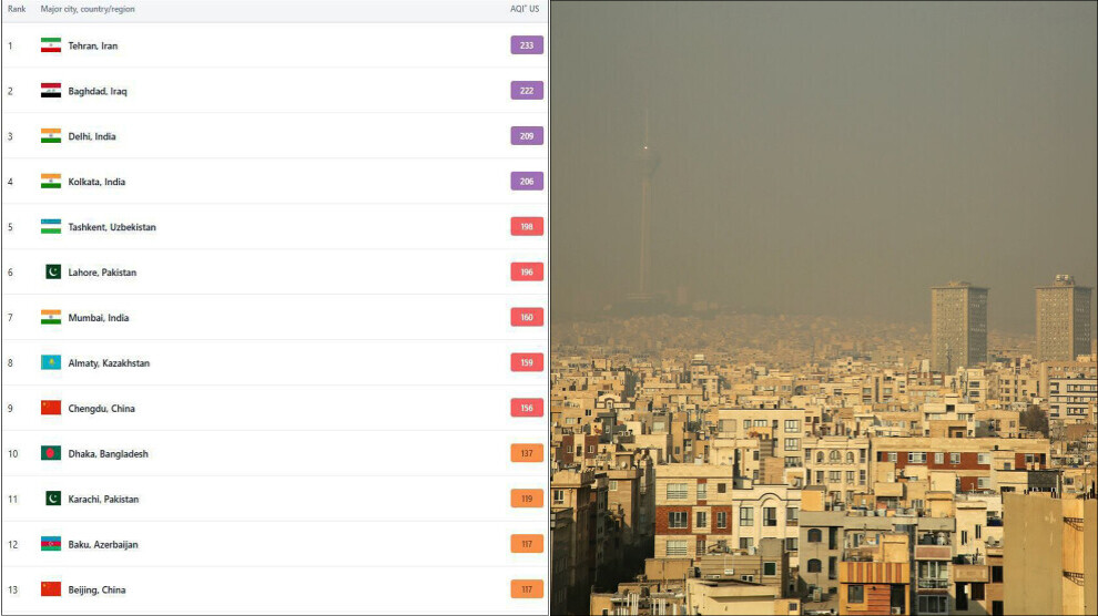 Navenda Nûçeyan – Li gorî lêkolînên şîrketa kalîteya hewa û jîngehê ya Swîsreyî IQAir, Tehran bi nirxa endeksê ya 233 gihîşt pozîsyona bajarê herî qirêj a cîhanê û bajarê Taşkent a Ozbekistanê jî bi nirxa endeksê ya 199 di rêza duyemîn de cihdigre.