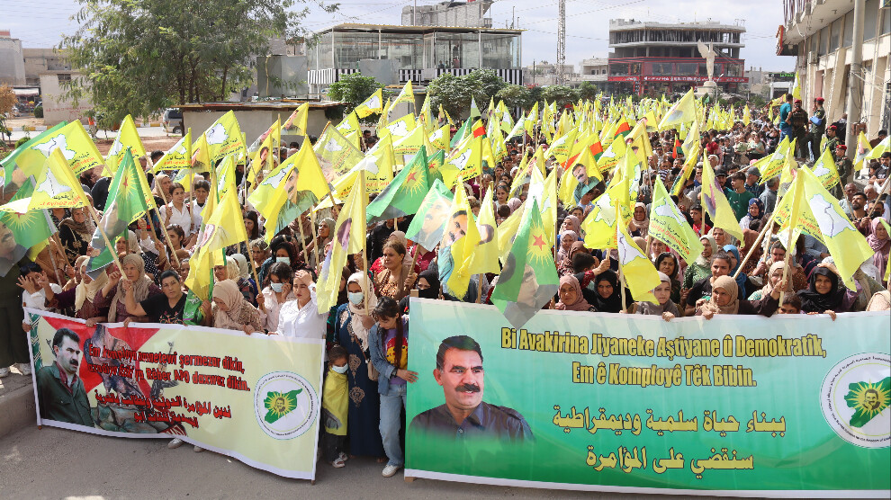 Navenda Nûçeyan – Bi boneya salvegera 27’emîn a komploya navneteweyî ku di 9’ê Cotmeha 1998’an de li dijî Rêberê Gelê Kurd Abdullah Ocalan pêk hatiye, di heman demê de ji bo salvegera êrîşên li ser bajarên Serêkanî û Girê Spî yên herêma Bakur û Rojhilatê Sûriyeyê ku di 9’ê Cotmeha 2019’an de ji hêla dagirkeriya dewleta tirk û çeteyên girêdayî wê ve hatiye destpêkirin, gelê herêma Bakur û Rojhilatê Sûriyeyê bi dirûşmeya “Em komployê şermezar dikin Rêber Apo fîzîkî azad bikin” daketin qadan û ev herdu bûyer bi tundî şermezar kirin.