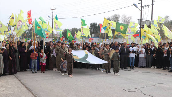 Şêniyên Wargeha Penaberan a Şehîd Rustem Cûdî Mexmûrê li dijî tecrîda girankirî ya li ser Rêberê Gelê Kurd Abdullah Ocalan û şermezarkirina qedexeyên hevdîtinê meşeke girseyî li dar xistin.