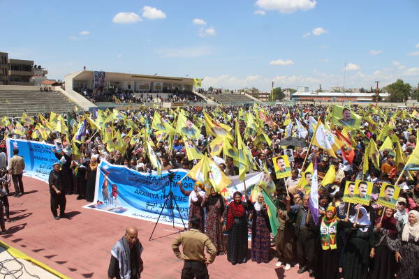 Mitîng li stadyuma Şehîdên 12'ê Adarê a bajarê Qamişlo- Bakur û Rojhilatê Sûriyê, di bin diruşmeya "Azadiya Rêber Apo misogeriya demokrasiyê û aramiya herêmî ye" destpê kir. Piştî deqeyek rêzgirtinê, Endama Desteya Rêveber a Partiya Yekîtiya Demokratîk (PYD) Asya Abdullah axivî.