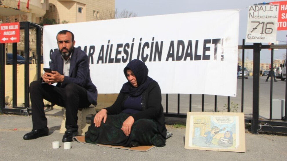 Malbata Şenyaşar ku ji Pirsûsê hatin Edliyeya Rihayê, li ber pankarta "Ji malbata Şenyaşar re edalet" nivîsîbû dest bi nobetê kirin.