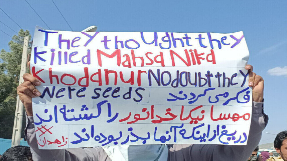 Serhildêrên bajarê Zahidanê li dijî gelên Beluc, Kurd, Ereb û gelên bindest dirûşmeyên li dijî gelên din berz kirin. Her wiha bi daliqandina pankartên cuda diyar kirin ku heta azadiya xwe ew ê têkoşîna xwe bidomînin.