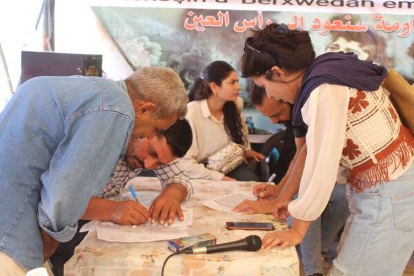 Îro li Kampa Serêkaniyê, Waşokanî û hemû navendên ku koçberên Serêkaniyê lê bi cih bûne, kampanyaya berhevkirina îmzeyan dest pê kir. Li Kampa Serêkaniyê û Waşokanî kon hatin vedan. Beriya ku kampanya dest pê bike, Hevserokê Meclisa Kampa Serêkaniyê Ebdulrezaq Mihemed axivî û tekez kir ku di encama dagirkerina Serêkaniyê de bi kêmanî nêzî 200 hezar sivîl koçber bûne û bi sedan jî birîndar bûne û got: “Li Serêkaniyê sûcên şer û talankirina mal û milkên sivîlan dewam dikin.”