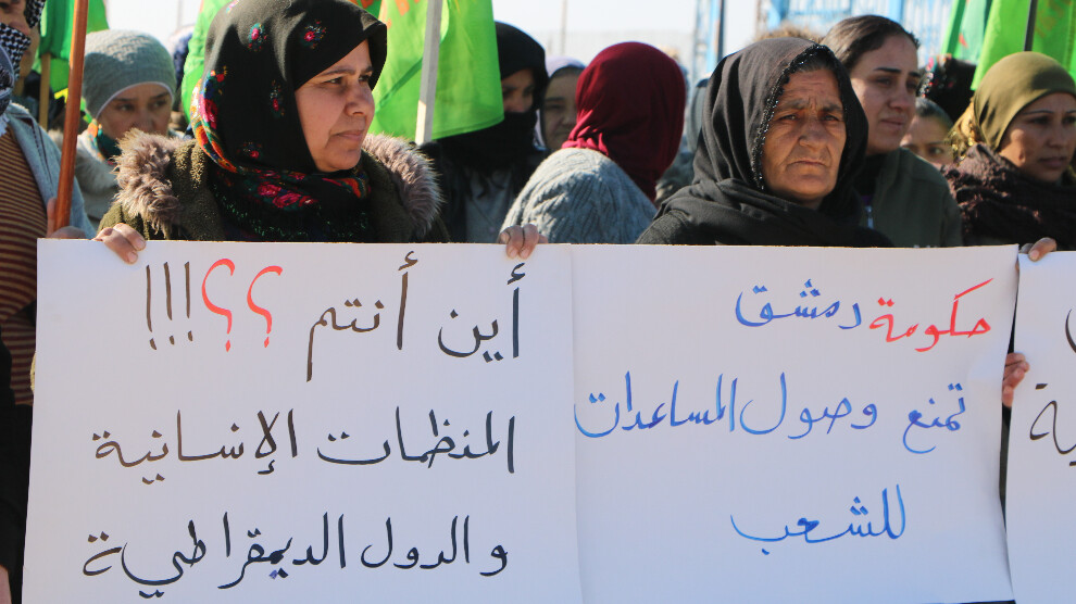 Di daxuyaniyê de pankartên bi nivîsa “Dorpêça li ser gelan karesata mirovî zêde dike”, “Na ji dorpêçê re” hat hildan û bal lê hat kişandin ku dorpêç, rêgirî û astengkirina alîkariyan karesatê kûrtir dike. Her wiha bang li saziyên navnetewî hat kirin ku li dijî dorpêç û rêgiriyê helwestek tund nîşan bidin.