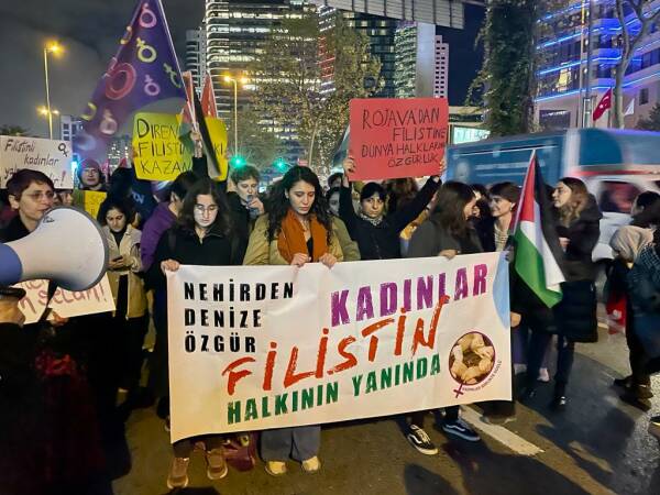 Di meşê de pankartên "Ji Rojava heta Filistînê ji gelên cîhanê re azadî", "Ji jinên berxwedêr re hezar silav", "Li dijî qetlîamê em li ber xwe didin", "Jin jiyan azadî" “Bijî hevgirtina jinan a li dijî şer”, “Bedenên jinan ne qada şer e” hatin vekirin. Piştî meşê li ser navê jinan Selîn Top li ber Konsolosxaneya Îsraîlê daxuyanî xwend.