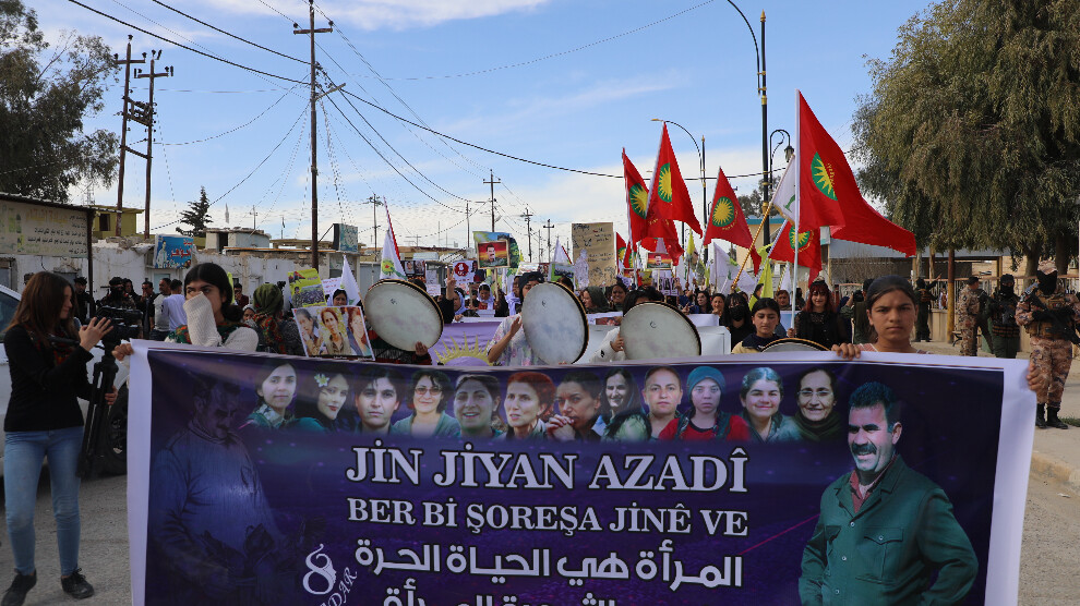 Jinên Êzidî bı boneya 8’ê Adarê Roja Jinên Kedkar yên Cîhanî bi diruşmeya ‘Bi Jin Jiyan Azadî Ber Bi Şoreşa Jinê ve’ herikîn Qadan.