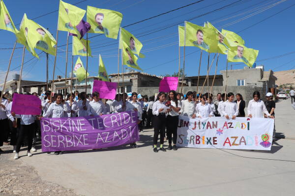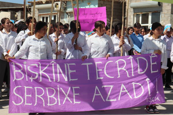 Li Wargeha Penaberan a Şehîd Rustem Cudî dibin kampanyaya ‘Jin Jiyan Azadî, Serbixe Azadî’ de xwandekarên jin ên Mexmurê ji bo tecrîda girankirî ya li ser Rêberê Gelê Kurd Abdullah Ocalan were rakirin meşek girseyî li darxistin.