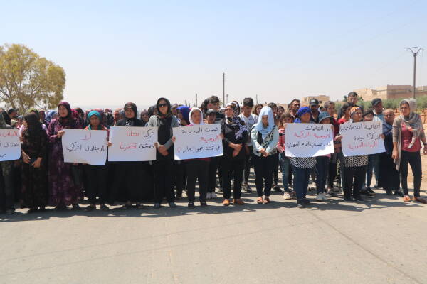 Di meşê de welatiyan pankertên bi nivîsên "Na ji dagirkeriya Tirk re","Tirkiyê me dikuje, Şam me dorpêç dike" û "Bêdengiya Rusya li hember qetilkirina me şerm e" hildan. Meşê ji çarxerêya gundê Wehşiyê heya baregeha Rusan bi berzkirina diruşmeyan berdewam kir. Paşê li ser navê koçberên Efrînê şandeyek derbasî gel kesên peywendîdar bûn û nameya gel a xwestina mafê xwînê zarokên xwe û şermezarkirina êrîşên dagirkeriyê li ser herêmê, ji wan re ragihandin.