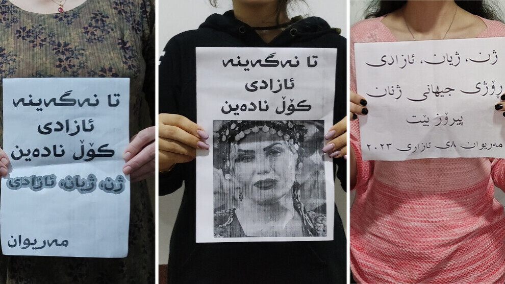 Jinên Merîwanê ku diyar kirin ew ê Nesrîn Qadrî ya ku di serhildanên bi boneya 8'ê Adarê Roja Jinên Kedkar ên Cîhanê li Îran û Rojhilatê Kurdistanê de hat qetilkirin ji bîr nekin û wiha gotin: "Dirûşmeya Jin, jiyan, nexşeya rêya azadiya me ye.”