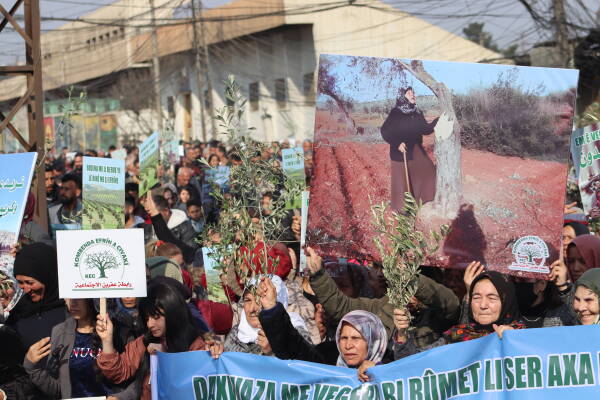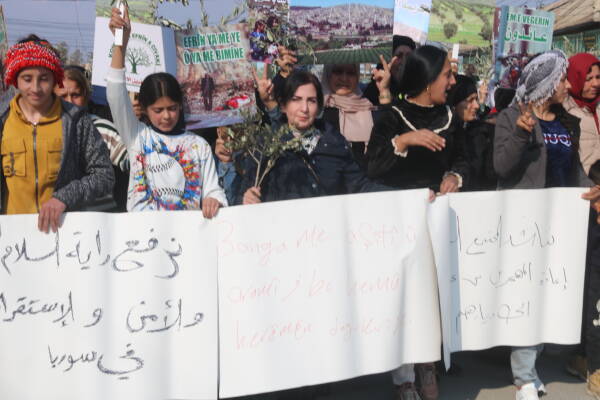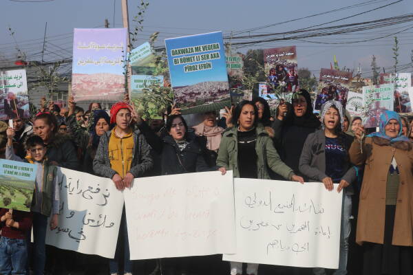 Piştî deqeyek rêzgirtinê, koçbera ji Efrînê Peyman Muso têkildarî meşê ji ajansa me re axivî û got: “Dewleta Tirk a dagirker di sala 2018’an de êrîş li ser bajarê Efrîn pêk anîn û em neçar kirin ku em ji bajarê xwer derkevin û koçber bibin. Bi zor û zehmetî me berê xwe da Kantona Şehbayê. Piştî ku em 7 salan li kantona Şehbayê bicÎh bûn, êrîş û binpêkirin li ser me pêk anîn. Di riya koçberiyê de zarok û jinên me rastî gelek tundî, lêdan û destdirêjiyê hatin. Ji bo ku em bi ewle bijîn, me berê xwe da Kantona Cizîrê. Piştî rûxandina Esed daxwaza me ji Netewên Yekbûyî ev e. Em bi ewle vegerin bajarê xwe Efrînê û li wir bi rûmet bijîn. Em daxwaza vegera axa xwe dikin û dewlet Tirk şermezar dikin. Daxwaza me ji saziyên mafên mirovan ew e ku hesabên van sûcên li hember me dikin, bê xwestin.”