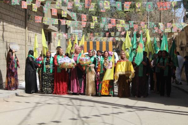 Jin bi cil û bergên xwe yên folklorî li ber navenda Kongra Star a bajarê Hesekê ya Taxa Merşo ya bajarê Hesekê kom bûn.