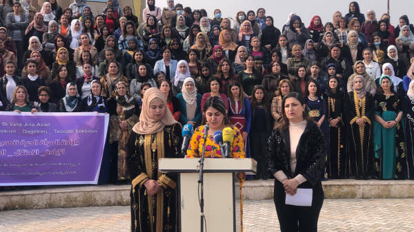 Hesekê- Platforuma Çalakiyên Hevbeş a Tevger û Rêxistinên Jinan ên Bakur û Rojhilatê Sûriyeyê, li Parka 4’ê Nîsanê ya bajarê Hesekê ya Kantona Cizîrê- Bakur û Rojhilatê Sûriyeyê di bin dirûşma “Bi vîna jinên azad em ê siyasetên qirkirin, dagirkerî û tecrîdê têk bibin” daxuyaniyek da û rêzeçalakiyên ji bo 8’ê Adarê hatin ragihandin. Bi dehan endamên rêxistin û tevgerên jinan bi cil û bergên xwe yên gelêrî beşdarî daxuyaniyê bûn.