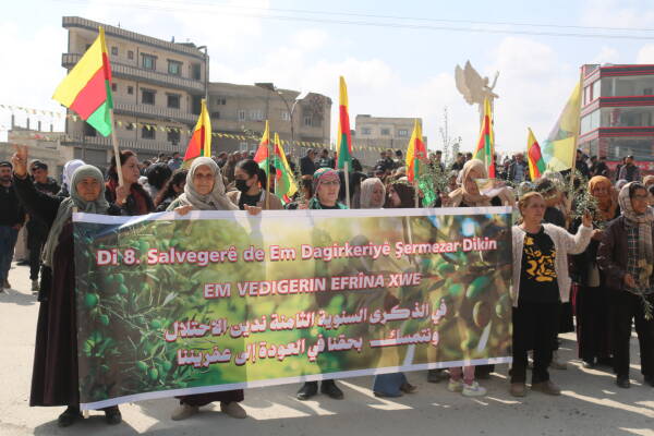 Bi sedan şêniyên bajarê Kobanê û koçberên Efrînê di 8’emîn salvegera dagirkirina herêma Efrînê de meşiyan. Kobaniyan diyar kirin ku ewê ji bo ji nû ve avakirina Efrînê xebatên kolektîf bimeşînin.
