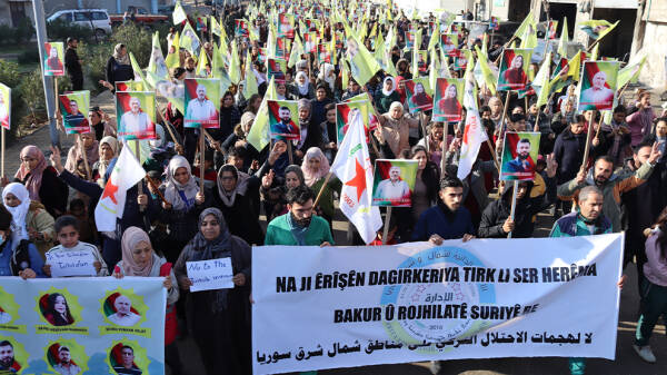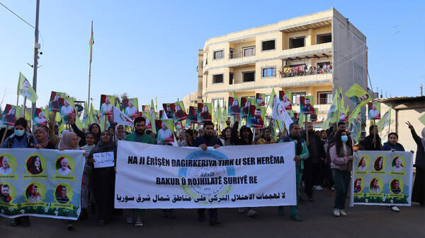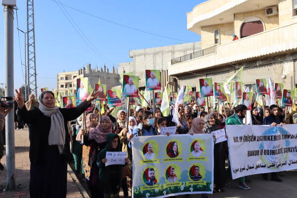 Di meşa ku di bin diruşmeya “Na ji êrîşên dagirkeriya tirk li ser herêmên Bakur û Rojhilatê Sûriyê” hat birêxistinkirin, gel posterên rêberê gelê Kurd Abdullah Ocalan, wêneyên sivîlên ku di êrîşên li ser Qamişlo de jiyana xwe ji dest dan hilgirtin.