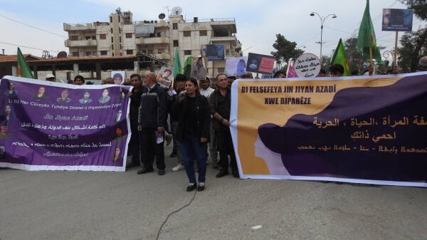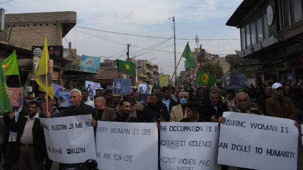 Li bajarê Qamişlo ya Kantona Cizîrê mêr bi dirûşmeya “Bi felsefeya Jin Jiyan Azadî xwe biparêze” li dijî her cûre tundiya li ser jinê meşiyan. Mêrên ku beşdarî meşê bûn gotin ku ew rexnedana xwe didin jinan.
