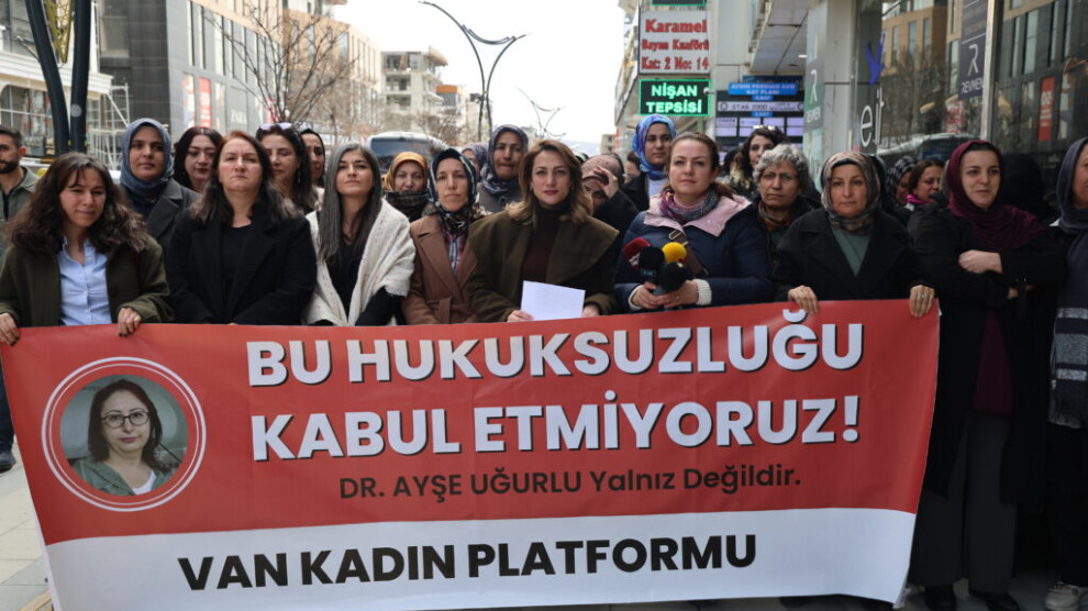 Navenda Nûçeyan – Platforma Jinan a Wanê, ji bo Dr. Ayşe Ugurlu a di Gulana 2025’an de bi hinceta “heqaret li meqama serokkomariyê kiriye” ji karmendiya dewletê hatiye derxistin û derbarê wê de lêpirsîn hatiye destpêkirin, li pêşiya Aydin Perîhanoglû AVM’ê daxuyaniyek da. Di daxuyaniyê de pankarta “Em vê bêhiqûqiyê qebûl nakin” hat vekirin û dirûşma “Jin Jiyan Azadî” hat berzikirin. Tevî endamên platformê gelek jin tev li daxuyaniyê bûn.