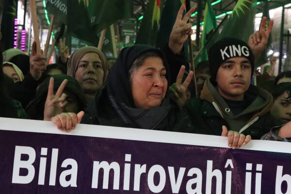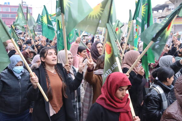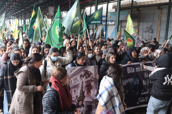 Jinên ji bajarê Kobanê û Sirînê yên Kurd û Ereb, siyasetmedar, çalakvan û hwd li qada jina Azad kombûn û bi bilindkirina alên Kongra Star, wêneyên şehîdan  û kiryarên ku hatin meşandin û pankarta bi nivîsên “Bila mirovah bêdengiya xwe bişkîne, na ji qetilkirina jinan û zarokan re” meşa xwe bi hêrseke mezin destpêkirin. Jinan di dirêjahiya meşê de bê navber bi tilîlî, diruşmên “Tolhildan soza me ye”, “Qatil Colanî”, “Jin, jiyan, azadî” û “Berxwedan jiyan e” bersiva dagirkeriyê dan.