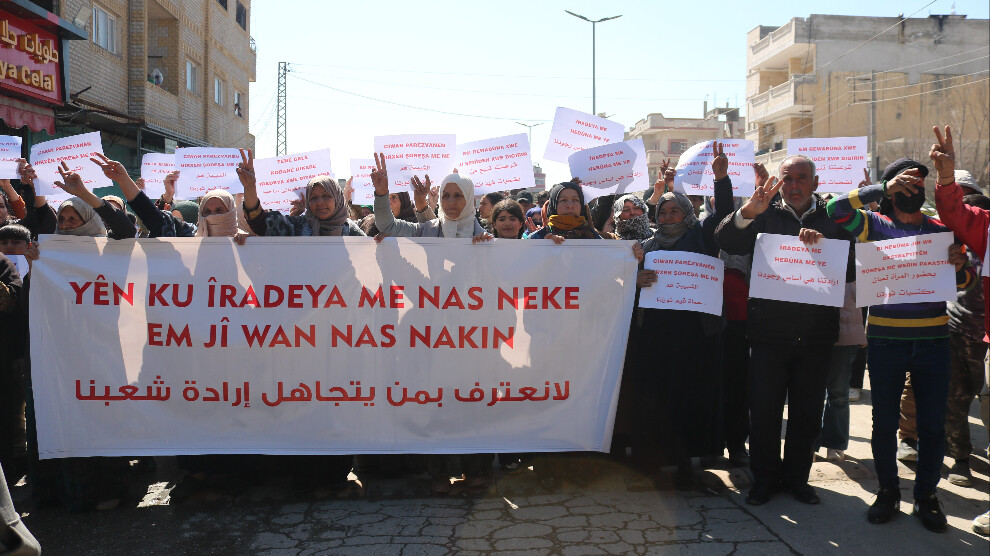 Li dijî biryara erkdarkirina rêveberiya Herêma Kobanê ji aliyê hikûmeta Şamê ve gelê Kobanê çalakiya protestoyî li dar xist. Gel û jinan tekez kirin ku yên vîna wan nas nekin ew jî wan nas nakin.