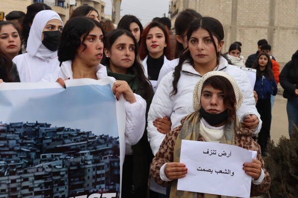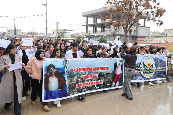 Xwendekarên ku li pêşiya Zanîngehê ya li taxa Kobaniya Nû kombûn bi hêrseke mezin ber bi qada Jina Azad ve meşiyan. Di meşê de bê navber diruşmên “Berxwedan jiyane”, “Bijî berxwedana Şêx Meqsûd û Eşrefiyê” û “şehîd namirin” hatin berzkirin.