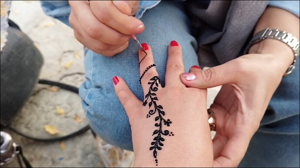 Mehnaz Namdarî, li ser maseya xebatê disekine, firçe û rengên xwe sererast dike. Boyax û pênûsên wê ji bo nexşan li ser rûyê zarokan xêz bike û motîfên bi hineyê li ser destên jinan çêbike amade ye û wiha dibêje: “Ez li Merîwanê ji dayîk bûme. Di qada boyaxkirina zarokan û boyaxkirina rûyan de dixebitim. Min li Tahran û Merîwanê perwerde dîtiye. Beriya salan li vê derê xizmetên wiha tunebûn. Di rojên rojbûn û çalakiyên zarokan de ev tişt tunebûn. Halbukî li van bajaran huner gelek belav bûye.”
