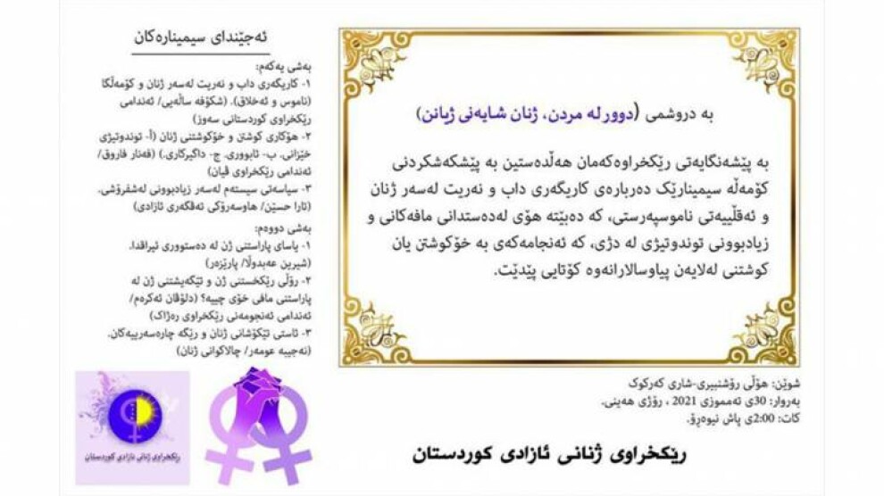 لەپێناو بەدەستخستنی مافی ژنان و وەستاندنەوە بە ڕووی ئەقڵیەتی پیاوسالاری و دەرخستنی توانای ژنان و تێکۆشانیان، ڕێکخراوی ژنانی ئازادی کوردستان، سیمینارێک لە شاری کەرکوک بەڕێوەدەبات.