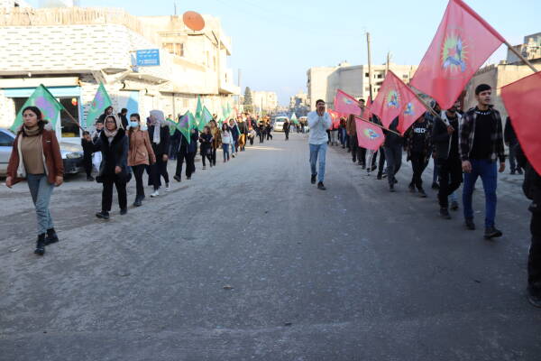 سەرەڕای بۆردوومانی قورس لە ناوەندی کۆبانێ کە گەڕەک و ژێرخانی ناوچەکەی کردە ئامانج، یەکێتی ژنانی گەنج و تەڤگەری گەنجانی شۆڕشگێڕ ڕێپێوانێکیان بە دروشمی "دژی هێرشە داگیرکارییەکان جەنگی ئازادی سەربخەن و ئازادی جەستەیی ڕێبەر ئاپۆ مسۆگەر بکەن" ڕێکخست، ڕێپێوانەکە لەبەردەم ئەو ماڵەی گەڕەکی شەهید پایمان کۆتایی پێهات کە لە ٢٥ی کانوونی یەکەمی ٢٠٢١ بە فڕۆکەی بێفڕۆکەوان هێرش کرایە سەر  یەکێتی ژنانی گەنج و تەڤگەری گەنجانی شۆڕشگێڕی کانتۆنی فورات و بەهۆیەوە نوژیان ئۆجالان، ڤیان کۆبانێ، ڕۆژین ئیسۆ، مەرهەف ئیبراهیم، وەلید حوسێن و مەسعود ئیبراهیم شەهید بوون و دوو کەسی دیکەش بریندار بوون.