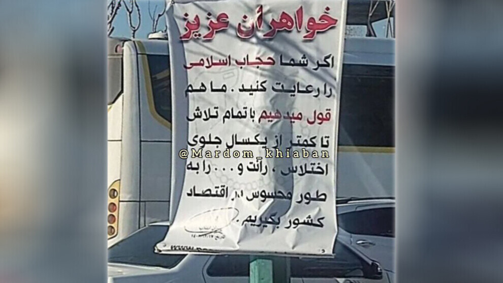 لە چەند ڕۆژی ڕابردوودا لافیتەیەک لەسەر ڕێگایەکی خێرا لە تاران هەڵواسرا کە لەسەری نووسرابوو، ''خوشکانی ئازیزم ئەگەر پابەند بن بە حیجابی ئیسلامییەوە، بەڵێن دەدەین هەمووهەوڵێک بدەین بۆ ئەوەی بە شێوەیەکی بەرجەستە ڕێگری لە گەندەڵی و قازانج لە ماوەی کەمتر لە ساڵێکدا لە وڵاتدا بکەین''، وێنەی ئەو لافیتەیە بە شێوەیەکی بەرفراوان لە تۆڕە کۆمەڵایەتییەکاندا بڵاوبووەتەوە و کاردانەوەی تووڕەیی هاووڵاتیان و میدیاکانی لێکەوتووەتەوە، کە بە بەڵگەی دژایەتیی لە گوفتارێکی ڕەسمی لە ئێراندا دەیبینن.