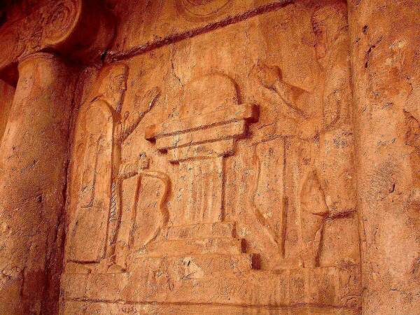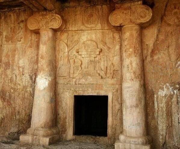 لە ڕووکاری دەروەی ئەم ئەشکەوتە و لەسەر دەرگای چوونە ژوورەوە وێنەی دوو پاشا بەدیدەکرێت، وەک باس دەکرێت یەکیان کەیخوسرەو و ئەوی دیکەیان پاشای لیدیەکان دەبێت. ئەم دوو پادشایە لەبەرامبەر یەکدا ڕاوەستاون و دەستیان بەرزکردوەتەوە و کەوانەکانیان لەسەر زەوی داناوە کە بە نیشانەی ئاشتی دێت.